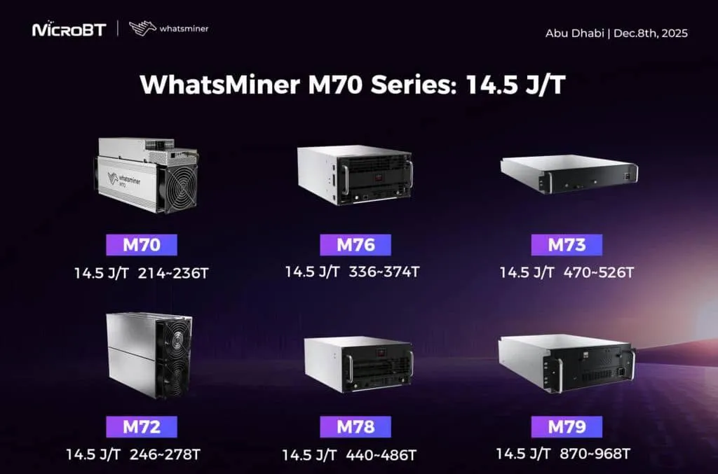 8 декабря 2025 года на выставке Bitcoin Mena в Абу-Даби компания MicroBT представила долгожданную линейку устройств серии M70 и следующие поколения WhatsMiner — M73, M76, M72, M78 и M79.
